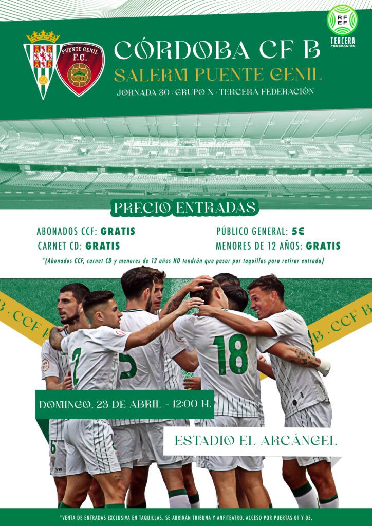 El Córdoba CF B jugará este domingo, día 23 de abril, a partir de las 12:00 horas en el estadio municipal El Arcángel ante el Salerm Puente Genil. Último partido de liga regular y en el que el filial blanquiverde podría conseguir el objetivo del ascenso.