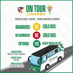 El Córdoba Club de Fútbol fletará un autobús para los aficionados que se quieran desplazar el sábado, 8 de abril, al estadio Linarejos para ver el enfrentamiento de su equipo al Linares Deportivo (19:00 horas). El club ofrece el desplazamiento a un precio de 6 € para abonados, siendo el coste para no abonados 9 €.